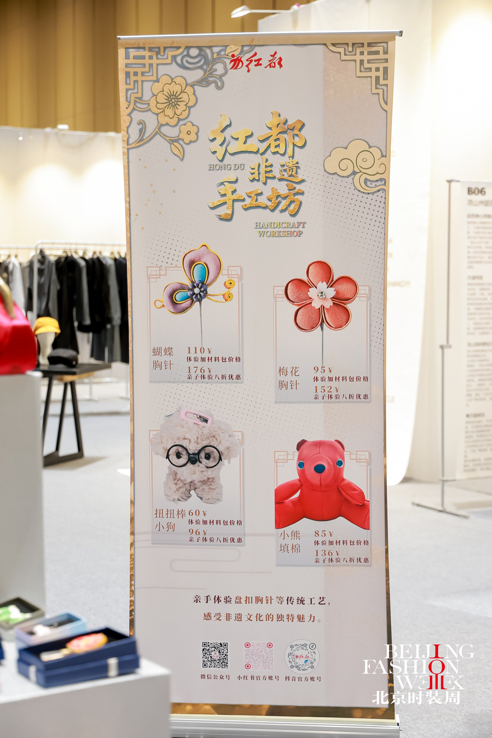 非遗展区无疑是本届展会中最具魅力的文化展区之一。红都品牌在展位呈现了一场别开生面的非遗手工坊活动,设置了互动体验环节。在红都师傅的指导下,观众可尝试制作传统盘扣胸针,于一针一线中沉浸式感受中国传统服饰的精巧之美。此外,手工坊还准备了趣味手工体验,观众可亲手制作小熊、扭扭棒小狗等可爱作品,让非遗技艺以更轻松活泼的方式融入现代生活。通过这一方非遗天地,不仅传承了匠人之心,更传递了人与人之间的温度,让古老技艺焕发出崭新的生命力。